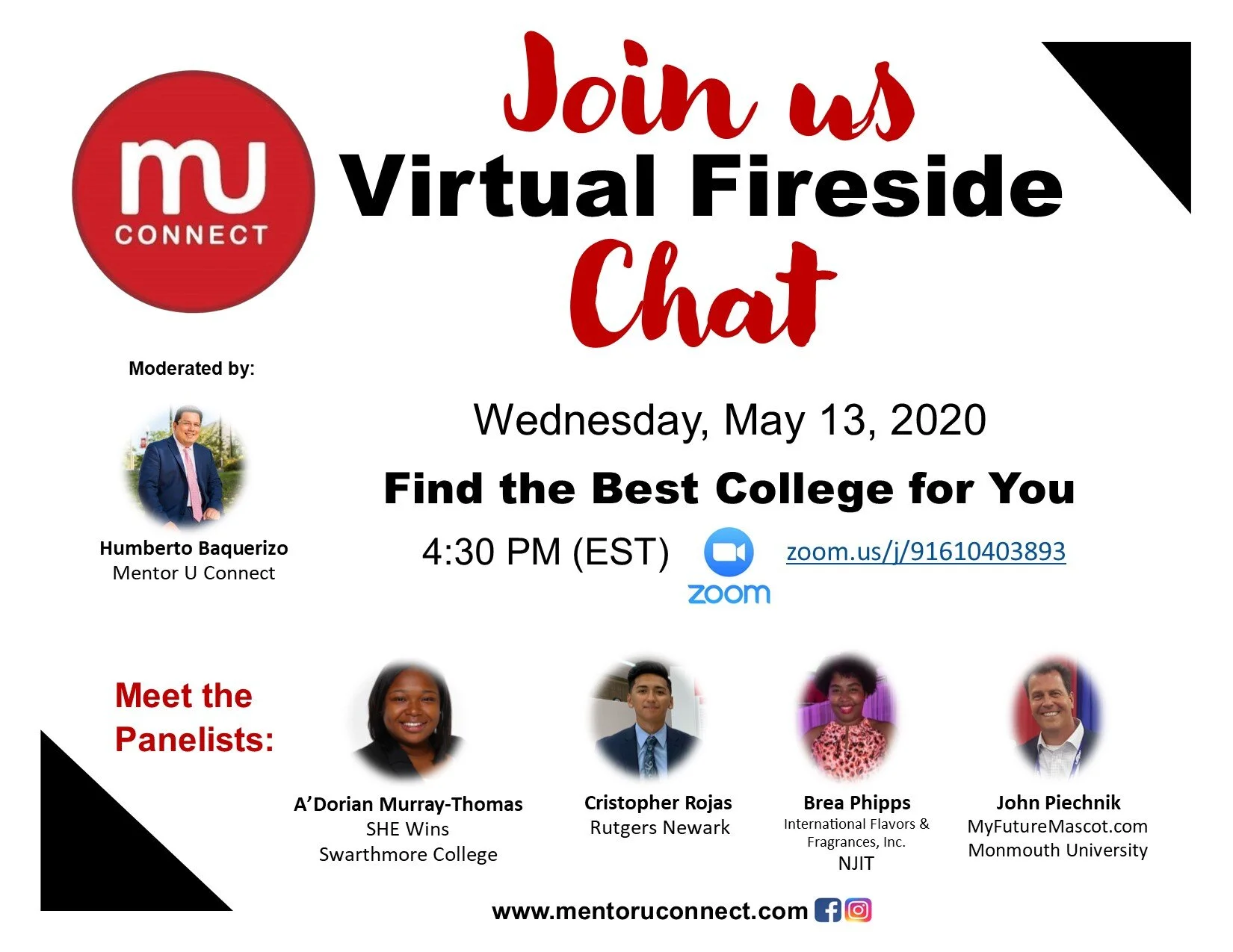 Join for our First Mentor U Virtual Fireside Chat. Find the Best College for You, Wednesday, May 13, 2020 at 4:30 PM Via Zoom. Our amazing panelists bring their knowledge and experience to help you find your college fit. Join us for a Chat with A’Dorian Murray-Thomas, Cristopher Rojas, Brea Phipps, and John Piechnick